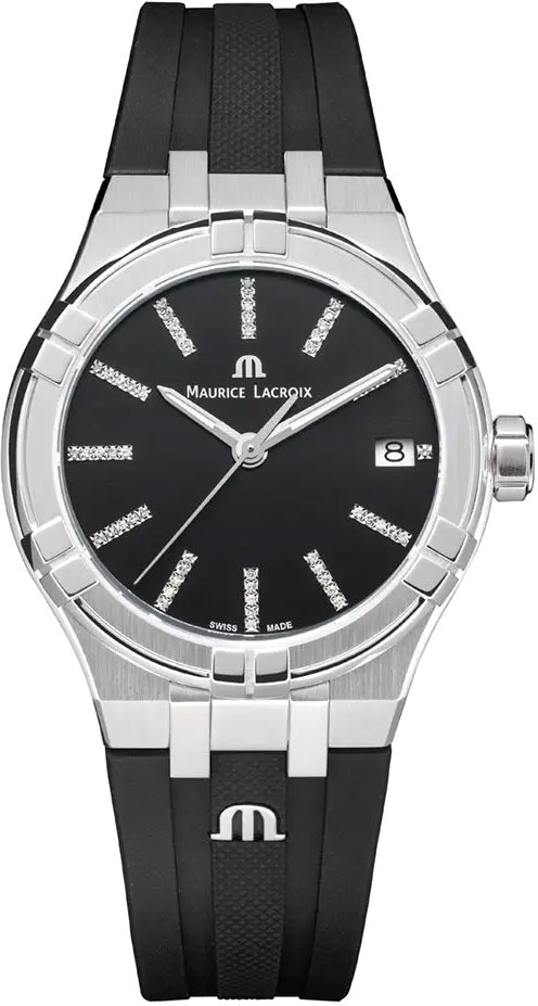 Водонепроницаемость до 10 бар позволяет носить часы во время плавания или занятий спортом, не опасаясь повреждений. Черный циферблат с индексами, инкрустированными бриллиантами, и стрелками с алмазной обработкой придают модели роскошный вид, а люминесцентное покрытие Super-LumiNova обеспечивает хорошую видимость в темноте. Каучуковый ремешок черного цвета и пряжка из нержавеющей стали делают часы комфортными для ношения, а диаметр 35 мм идеально подходит для изящного женского запястья.